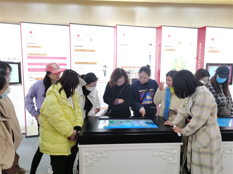 隨后,“娘子軍”們前往宣城宛陵湖法治文化館參觀(guān)。大家認(rèn)真聆聽(tīng)講解員的講解,依次參觀(guān)了“尊法學(xué)法”“守法用法”“普法路上”三個(gè)展區(qū),現(xiàn)場(chǎng)學(xué)習(xí)了法治文化,觀(guān)看了宣城市普法宣傳片和法治故事短片,體驗(yàn)了法治模擬場(chǎng)景。通過(guò)參觀(guān)學(xué)習(xí),進(jìn)一步增強(qiáng)了她們尊法學(xué)法守法用法意識(shí),將法治觀(guān)念融入今后工作和生活中,做到廉潔從業(yè),依法履職。